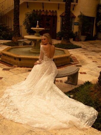 Sweet heart neckline with illusion lace sleeves with low back. fully embroidered lace a line skirt finishes the gown.